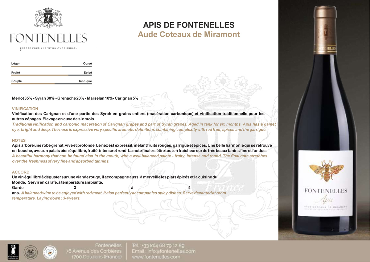 Traditional vinification and carbonic maceration of Carignan grapes and part of Syrah grapes. Aged in tank for six months. Apis has a gamet eye,  bright and deep. The nase is expressive very specific aromatic definitions combining complexitywith red fruit, spices and the garrigue.